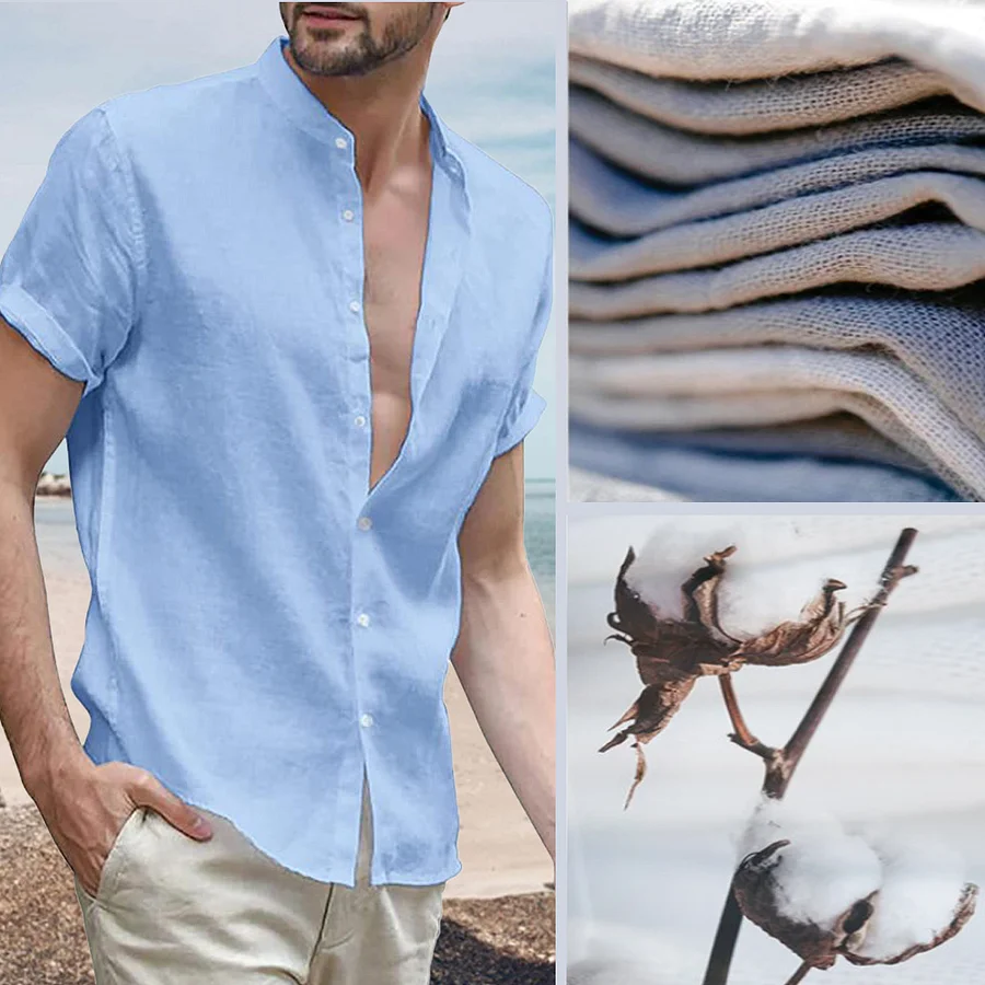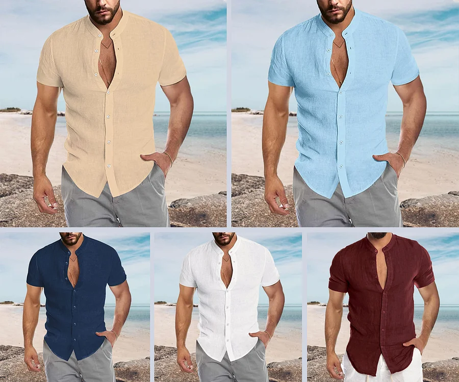 1* Camicia a maniche corte in lino con colletto alla coreana estivo da uomo