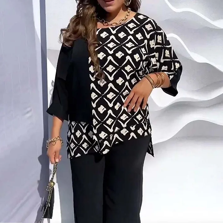 Il classico design retrò con stampa di giunture nere e beige crea uno stile sofisticato e unico. L'orlo irregolare è elegante e fluido e le mezze maniche sono traspiranti e confortevoli.