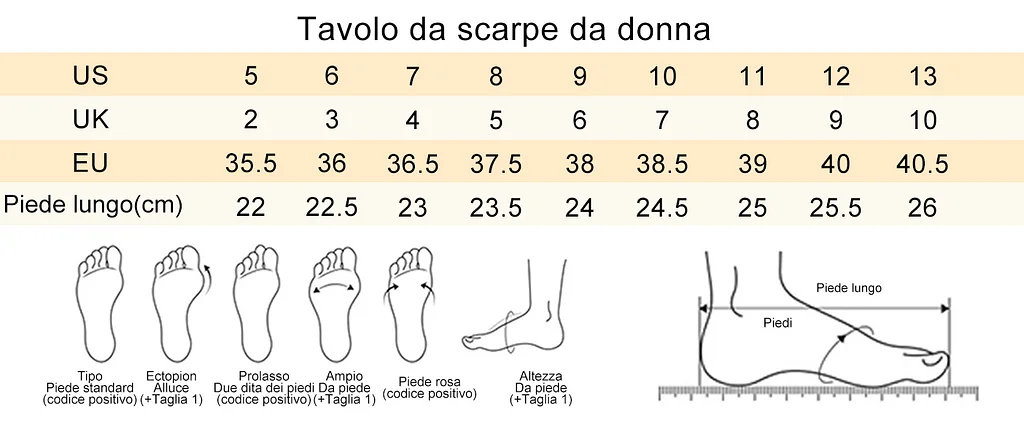 1. Scegli la taglia in base alla lunghezza dei tuoi piedi (non scegliere la taglia in base alla taglia abituale del tuo paese!!!)