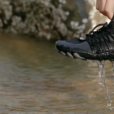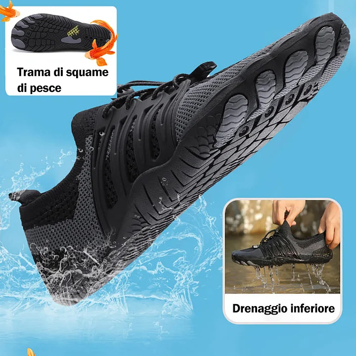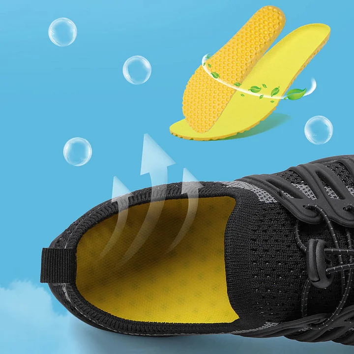 1️⃣ Tomaia giuntata - Realizzata in morbida rete traspirante e materiale plastico liscio e impermeabile, è traspirante e ad asciugatura rapida, riducendo l'afa e mantenendo i piedi asciutti.