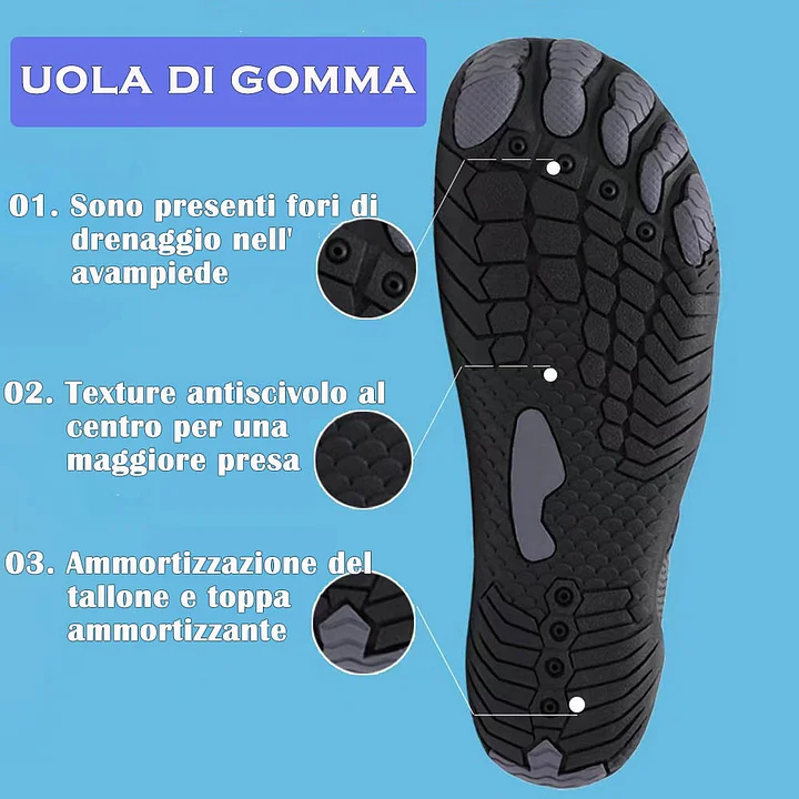 2️⃣ Suola in gomma - Suola in gomma leggera progettata con fori di drenaggio, texture antiscivolo e toppe ammortizzanti. Si adatta facilmente a vari terreni.